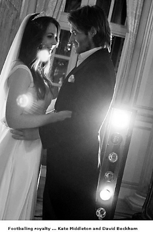 照片中,不仅有一众响当当的人物和众多王室成员一起跳康加舞的画面,还有醉倒在楼梯上、一只手还拿着酒瓶的哈里王子,甚至还有新娘米德尔顿·凯特和“万人迷”大卫·贝克汉姆含情脉脉翩翩起舞的场景。