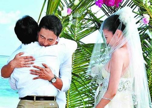新郎杨晨(中)拥抱新娘父亲(左)谢亲恩,林熙蕾满脸感动。(图片来源:台湾苹果日报)上一页12345678910