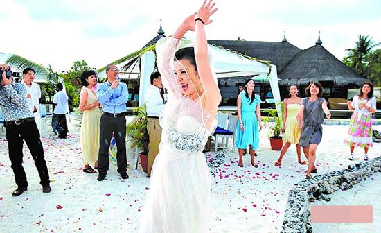 新浪娱乐讯 北京时间3月29日消息,据台湾媒体报道,女星林熙蕾昨天与相恋不足半年的商人杨晨在马尔代夫结婚。好友舒淇特意请假飞去祝贺,并送上金手镯当作贺礼。杨晨外型高壮,神似香港混血男星王敏德。图为林熙蕾扔花球 。