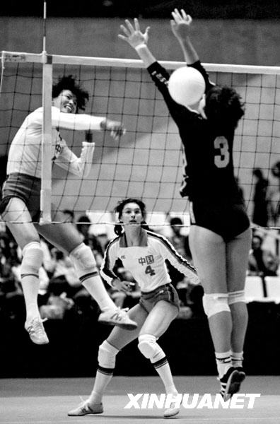 1981年11月,中国队在日本举行的第三届世界杯女子排球赛中,以七战七捷的佳绩,首次登上世界冠军领奖台。这是11月7日,中国选手陈招娣(左)在与巴西队的比赛中,跳起扣球。新华社发