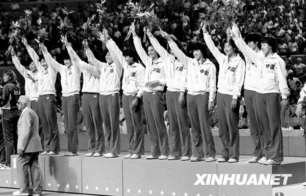 1984年8月7日,中国女排在第23届奥运会女排决赛中,以3比0战胜美国队,实现“三连冠”。这是中国队员在领奖台上向观众招手致意。新华社发