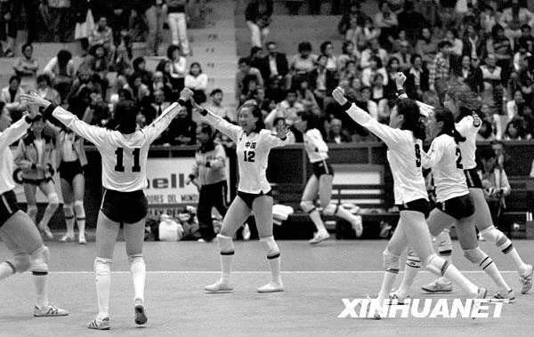 1982年9月,第九届世界女子排球锦标赛在秘鲁进行。中国队以9战8胜的战绩,第二次夺得世界冠军。这是9月20日,中国队以3比0胜苏联队后,队员们庆贺胜利。新华社发