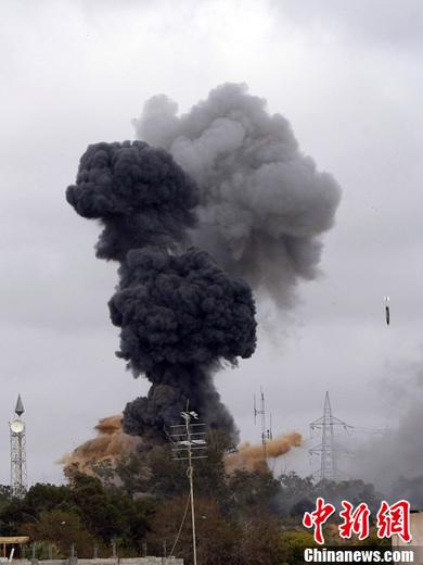 3月29日,利比亚首都的黎波里,利比亚领导人卡扎菲住所附近发生多起爆炸。图为驻利比亚记者拍摄到导弹落下瞬间。