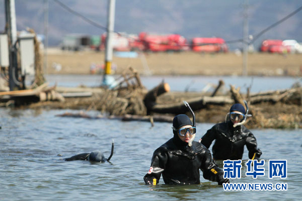 4月1日,搜救人员在日本宫城县被海水淹没的稻田里搜索遇难者的遗体。