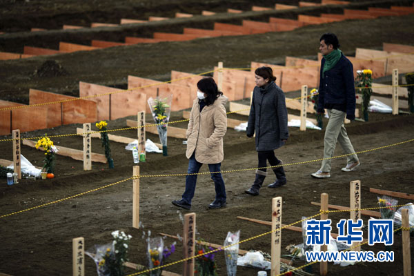 3月31日,在日本宫城县东松岛市,人们走过一处地震和海啸遇难者的临时集体墓地。