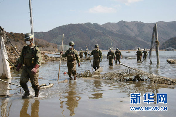 4月1日,自卫队士兵在日本宫城县被海水淹没的稻田里搜索遇难者的遗体。