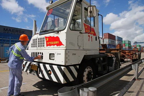 简介:宁波港北仑第二集装箱码头分公司“71号党员先锋车”于2010年7月1日正式挂牌,司机组3名流动党员扛起鲜红的党旗。