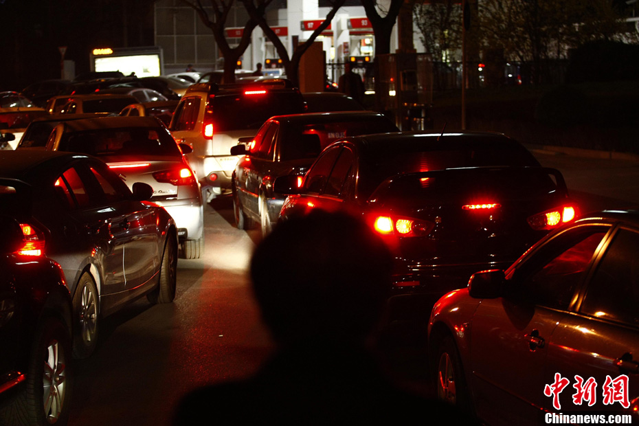 4月6日晚,民众在加油站前排队加油。中国国家发改委决定,自4月7日零时起,将汽柴油出厂价格每吨分别上调500元和400元,这是2011年内成品油第二次调价。中新社发 富田 摄