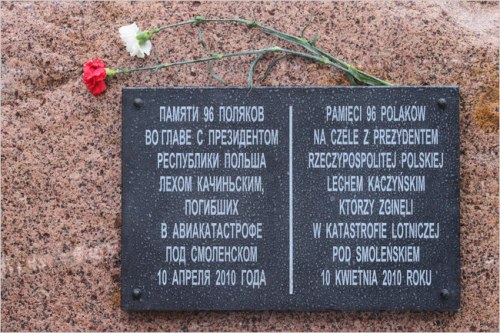 后来,新的碑文被改为“以此纪念2010年4月10日斯摩棱斯克空难中去世的波兰前总统莱赫?卡钦斯基及其随行人员共96人”。