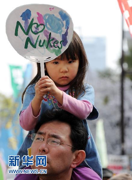 4月10日,在日本东京,一名4岁的小女孩和父亲一起参加反对滨冈核电站的抗议活动。 新华社发