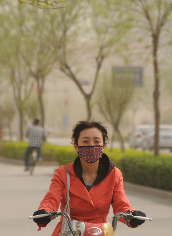 4月16日,一位石家庄市民戴着口罩在大风沙尘天气中骑行。