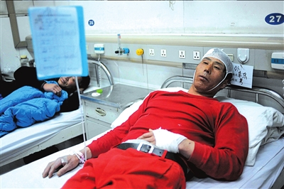 ③大兴,在建墙体被大风刮倒后砸伤的工人接受治疗。