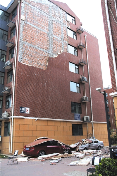 昨天下午1点,良乡镇西兰岛小区5号楼前,散落的碎片遍地都是,两大块面积约20平方米,厚8厘米的保温层将楼下两辆汽车“埋”住。其中一辆红色雪佛兰发动机前盖和车轮严重受损,另一辆捷达车顶被压塌。5号楼西侧3层往上至6层的墙体约一百平方米的外层全部脱落,露出的砖头和水泥十分显眼。