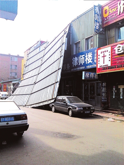 ⑤昌平,一栋二层楼的彩钢板屋顶被大风掀翻,砸到一辆轿车。 本版摄影本报记者王海欣朱嘉磊张沫王维维本报实习记者赵恩泽郑磊