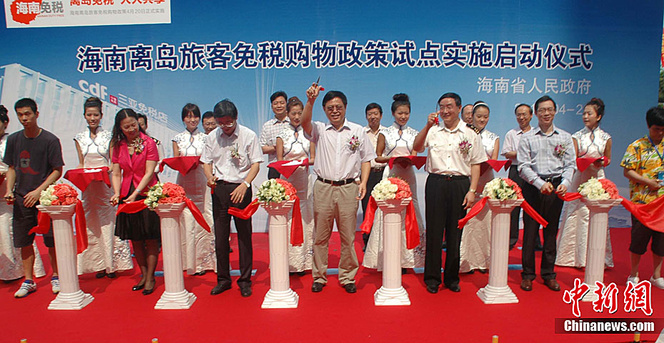 4月20日,海南“离岛免税”政策试点正式启动。海南省政府当日在目前唯一的试点商店三亚免税店举行该政策启动仪式。启动仪式过后,游客蜂拥进入三亚免税店选购物品,店内游人如织。图为海南省委常委、宣传部长、副省长谭力(中)为“离岛免税”正式实施剪彩。尹海明 摄