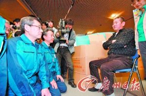 东京电力公司社长清水正孝(左侧戴眼镜者)双膝跪地,请求原谅。他身前,一名灾民在椅子上坐着,双臂交叉抱在胸前。