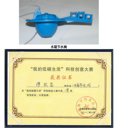 缪松昌住在鄞州区鄞江镇,由于在日常生活中积极实践节能环保的生活方式,具有较强的低碳环保意识,发现平时家里坐便器的用水量偏大,每次冲水时,无法控制冲水量,一按开关,整箱10多升的水全部冲光。缪松昌经过多年的努力和试验,发明了一个可以控制冲水量的“水箱节水阀”(也称马桶节水阀,形状与普通的橡皮阀相似),并获得了多项专利。