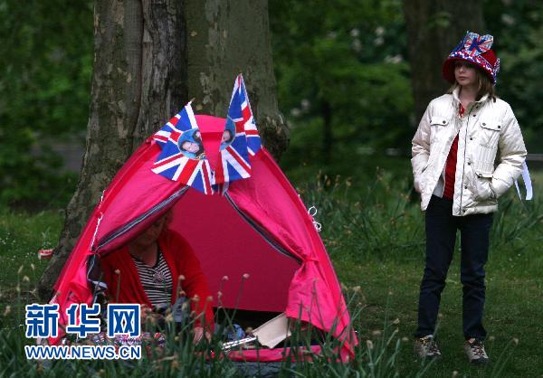 4月28日,在英国首都伦敦,一对母女在王室婚礼的巡游路线旁露营。新华社发(高塔姆摄)