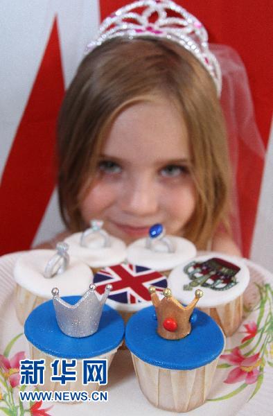 4月29日,马来西亚首都吉隆坡的一所英国学校的一名小学生展示为庆祝英国威廉王子和未婚妻凯特·米德尔顿的婚礼而制作的蛋糕。 新华社/法新