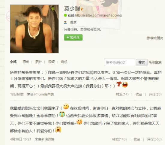 5月1日上午,莫少聪再次更新微博,祝福粉丝五一假期愉快,“所有的葱头宝宝早:)昨晚一直把所有你们对我说的话看完。让我一次又一次的感动。真的十分感谢我的宝宝们。是你们给了我很大的力量,今天是五一假期。祝愿大家有个愉快的假期,玩得开心:)最后我要很大很大声的说(我爱你们)耶。”