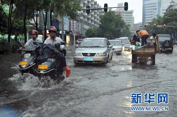 5月2日,车辆在广东清远积水的街道上行进。当日下午6时左右,一场强降雨导致广东清远市区多处道路积水,给市民出行造成不便。据气象部门消息,3至4日,广东省中北部地区将有大到暴雨,局地伴有短时雷雨大风、冰雹等强对流天气,南部地区将有阵雨天气。新华社发(李作描 摄)