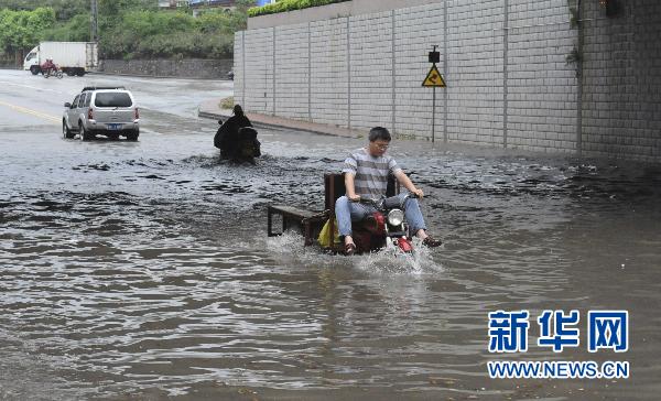 5月2日,广东清远街头雨后积水,一名市民涉水而过。当日下午6时左右,一场强降雨导致广东清远市区多处道路积水,给市民出行造成不便。据气象部门消息,3至4日,广东省中北部地区将有大到暴雨,局地伴有短时雷雨大风、冰雹等强对流天气,南部地区将有阵雨天气。新华社发(李作描 摄)