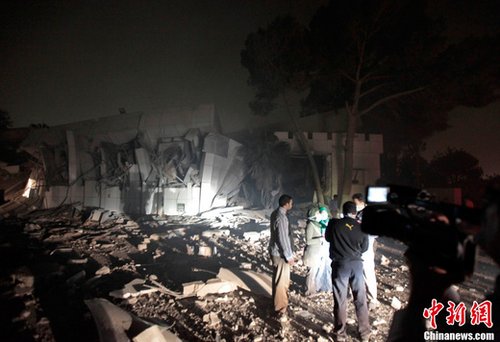 4月25日,在利比亚首都的黎波里,人们站在被轰炸的利比亚领导人卡扎菲的官邸旁。北约战机25日凌晨对利比亚领导人卡扎菲在的黎波里的官邸实施轰炸。利比亚政府官员谴责北约企图杀害卡扎菲,并称轰炸造成45人受伤、卡扎菲办公室受损严重。