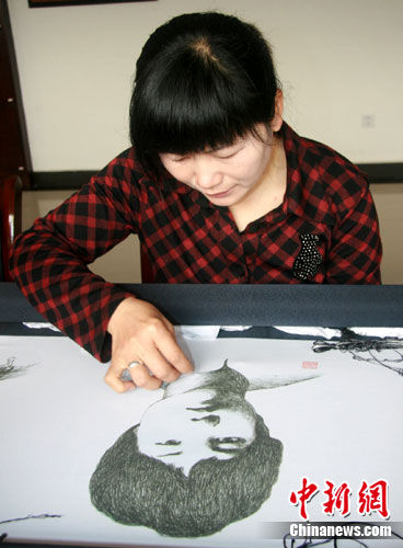 一名绣女正在绣制英模湘绣长卷中的杨开慧。中新网发 邓霞 摄