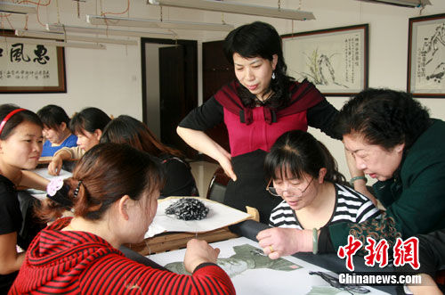 中国工艺美术大师江再红(右三)、国家级湘绣传承人刘爱云(右一)正指导绣女创作英模湘绣长卷。中新网发 邓霞 摄