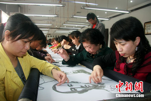 中新网长沙4月15日电(记者 邓霞)今年是中国共产党成立90周年。为纪念在新中国建立和建设中作出卓越贡献的湘籍共产党员,近百名绣女将联手创作一幅长12.1米、高0.5米的英模湘绣长卷。4月15日,该活动在“中国湘绣之乡”长沙沙坪镇开针施绣。