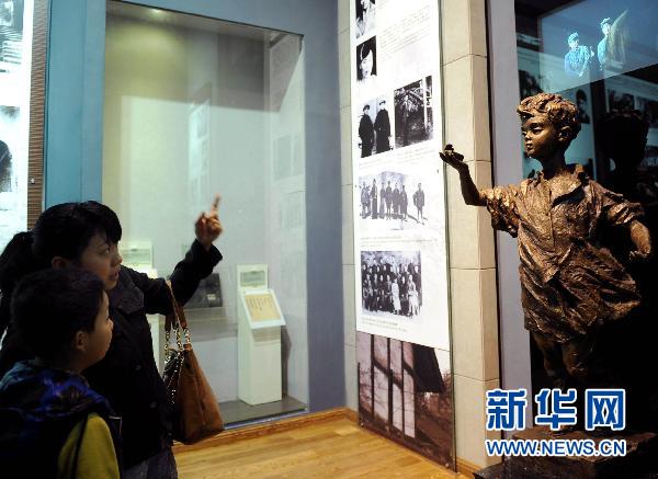 4月5日,在重庆歌乐山革命纪念馆,一位母亲在“小萝卜头”宋振中雕像前为儿子讲述“小萝卜头”的故事。新华社记者 周衡义 摄