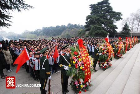 中国江苏网4月2日讯(记者徐关辉 袁涛)清明前夕的雨花台烈士陵园内,松柏苍翠,草木葱茏。今天上午,江苏省暨南京市各界在这里隆重举行纪念中国共产党成立90周年凭吊革命先烈活动。省市领导罗志军、李学勇、张连珍等,与各界代表2000多人一起,向雨花台烈士纪念碑敬献花篮,深切缅怀为民族独立、国家富强和人民幸福作出奉献与牺牲的革命先烈,深情表达继承先烈遗志,在新起点上开创科学发展新局面的信念与决心。