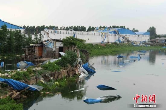 5月7日,佛山市南海区遭遇暴雨及龙卷风袭击,位于南海罗村街道联和大道旁广州军区佛山农场受龙卷风吹袭,多间厂房被掀顶或倒塌,涉及面积近万平方米,造成工人2死8伤。图为遭遇暴雨及龙卷风袭击的南海罗村街道联和大道旁多间厂房被掀顶或倒塌 。中新社发 梁永强 摄