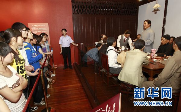 观众在一大会址纪念馆内参观复原的一大会场情景的蜡像(5月7日摄)。新华社记者 裴鑫 摄