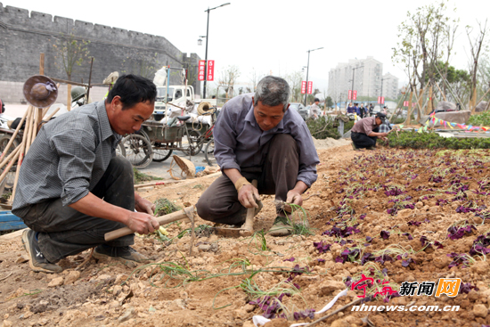 宁海新闻网讯 为迎接5·19中国旅游日和第九届中国徐霞客开游节的到来,近几日来,县园林部门组织力量对刚建设完工的西门城楼附属工程及徐霞客大道等地进行绿化。图为5月1日,绿化施工人员放弃节日休息时间,对徐霞客大道部分绿化带进行草皮和蔬菜类绿化。 (记者李江林摄)