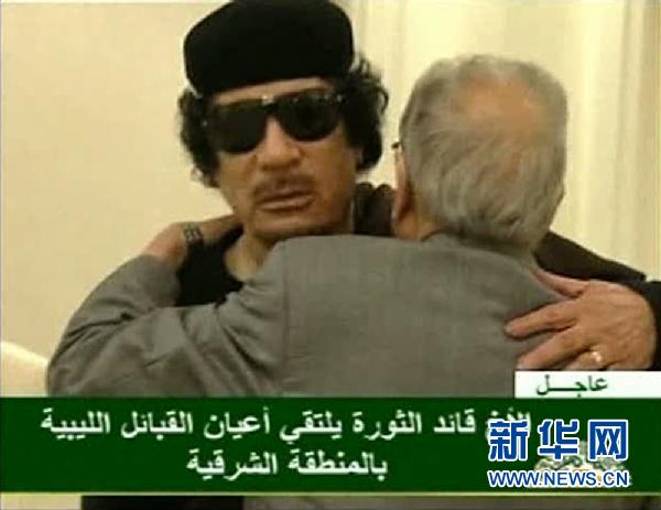 电视画面显示,卡扎菲身穿褐色长袍,戴着帽子和墨镜,正坐在椅子上和几名部落首领进行交谈。但报道没有说明此次会见的具体时间。