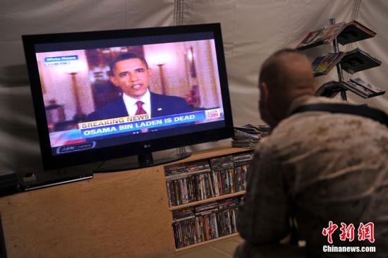 美国总统奥巴马在当地时间5月1日发表全国电视演讲,宣布“基地”组织领导人奥萨马·本·拉登已被打死。图为驻阿美军某团士兵关注奥巴马演讲的电视新闻。