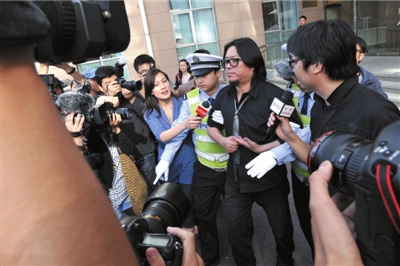 高晓松被从东城交通支队带出,大批记者到场围堵采访。
