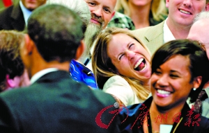奥巴马在中央情报局总部与热情的粉丝握手。