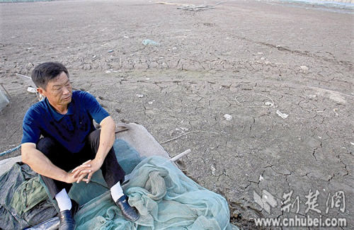 鱼池无水,渔民就失业了,大家每天蹲在岸边,祈盼着能有一场透雨。气象部门统计,今年以来,洪湖市降雨量明显偏少,累计降雨量为144毫米左右,与往年相比,减少七成,旱情为70年一遇。