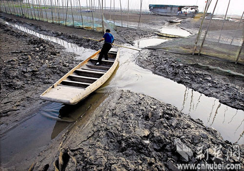 图为:湖底干涸后,渔船只能从极小的径流上出入