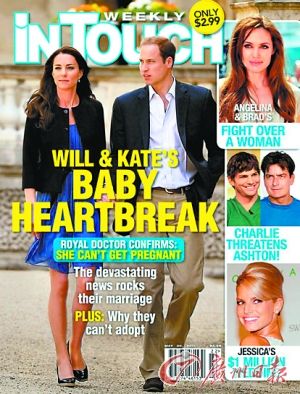 最新一期的美国八卦杂志《InTouch》封面用斗大标题爆料,“威廉凯特生子梦破灭”,副标题更是雷人“王室医生证实:她无法怀孕”。据文中宣称,卡米拉曾向友人嚼舌根:“听说凯特从青少年时期身体就不好,可能会影响受孕。”