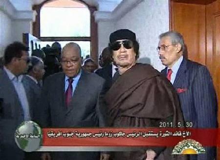 利比亚国家电视台当天晚间播放了卡扎菲和祖马会谈的画面。这是自5月11日以来卡扎菲的首次公开露面。据悉,北约此前曾暂时开放利比亚的禁飞区,以便让祖马乘坐的飞机在的黎波里的空军基地降落。