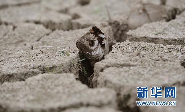 记者在东洞庭湖国家级自然保护区湿地拍摄到的一只死去的小鱼(6月1日摄)。今年以来的持续旱情,使被列入“世界重要湿地名录”的东洞庭湖自然保护区核心水域大幅萎缩,保护区内生物多样性遭到破坏。据介绍,整个保护区面积为1900平方公里,其中核心区域面积为290平方公里。现在核心区仅有水域面积43.5平方公里,其余85%均处于干旱状态。记者在保护区看到,原先湿地核心区域广阔的水域变成了茫茫的草地和零星的水洼。目前干旱已造成湿地沉水植被、定居性鱼类以及底栖生物如螺蚌等大量死亡。由于植被和鱼类大量减少,以此为食的鸟类数量将可能随之减少,江豚的取食难度也将增加。据东洞庭湖国家级自然保护区管理局采桑湖管理站站长高大力介绍,尽管目前冬候鸟已经北迁,但其后遗影响极有可能在今年下半年凸显。同时由于3到5月份是麋鹿产仔期,食物和水源受影响后,分布在洞庭湖区湿地约60头麋鹿的产仔和哺育也可能因干旱受到较大影响。新华社记者 李尕 摄