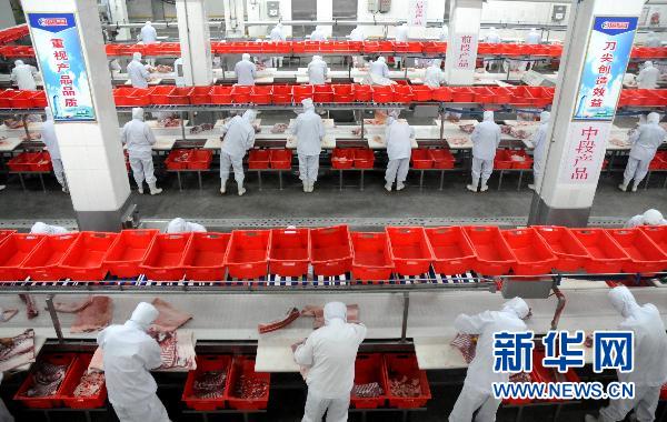 6月2日,河南济源双汇食品公司工作人员在分割车间工作。当日,“瘦肉精”事件的发生地、双汇集团子公司——河南济源双汇食品有限公司经过2个多月停产整顿后恢复生产。 新华社发(苗秋闹摄)