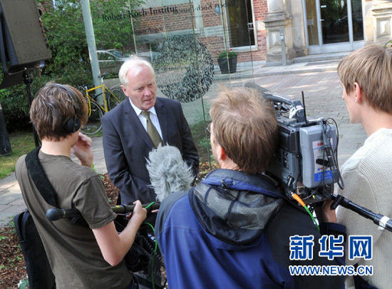 6月1日,在德国首都柏林,负责流行病预防研究的权威机构罗伯特·科赫研究所所长布格尔接受媒体采访。德国肠出血性大肠杆菌疫情蔓延状态继上周末和本周初呈现稳定迹象之后再次恶化,在过去的一天中德国各地确诊或疑似病例剧增了约500例,总数已经超过2000例。尤其值得注意的是,感染后出现溶血性尿毒综合症(HUS)的重症患者明显增多。罗伯特·科赫研究所6月1日公布的HUS重症病例比前一天增加了近100例,达470例,这是一个月以来重症病例增长最多的一天。新华社记者马宁摄