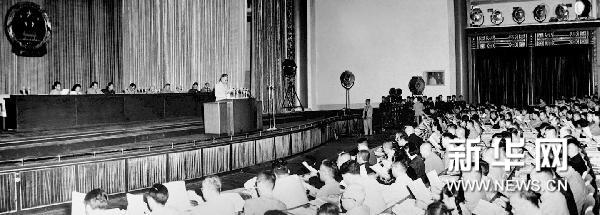 1954年9月15日,中华人民共和国第一届全国人民代表大会第一次会议在北京中南海怀仁堂开幕。这是刘少奇在会议上作《关于中华人民共和国宪法草案的报告》。 新华社发(资料照片)