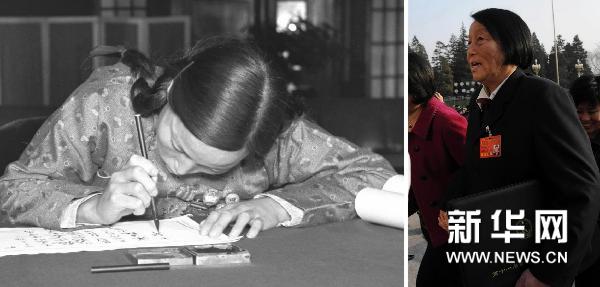 左图:1954年9月,出席第一届全国人民代表大会第一次会议的申纪兰代表在报到;右图:2008年3月5日,申纪兰代表走向人民大会堂,出席十一届全国人大一次会议开幕会。 新华社发(资料照片