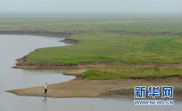 资料图:6月2日,记者拍摄的东洞庭湖国家级自然保护区湿地,因干旱湿地水域萎缩,大片草地裸露。新华社记者 李尕 摄