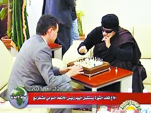 利比亚国家电视台6月12日拍摄的电视画面显示,利比亚领导人卡扎菲会见国际象棋联合会主席伊柳姆日诺夫时与其对弈。 新华/路透